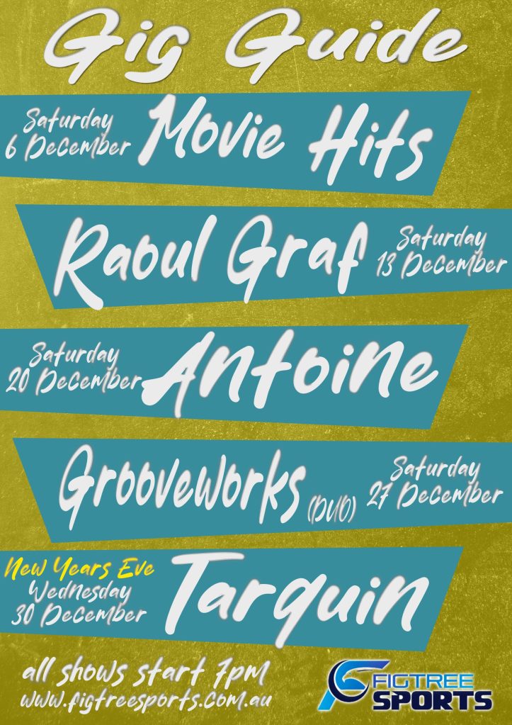 #LiveMusic #GigGuide #DecemberGigs #FigtreeSports #WollongongMusic #NYE #WeekendVibes #MovieHits #RaoulGraf #Antoine #Grooveworks #TARQUIN